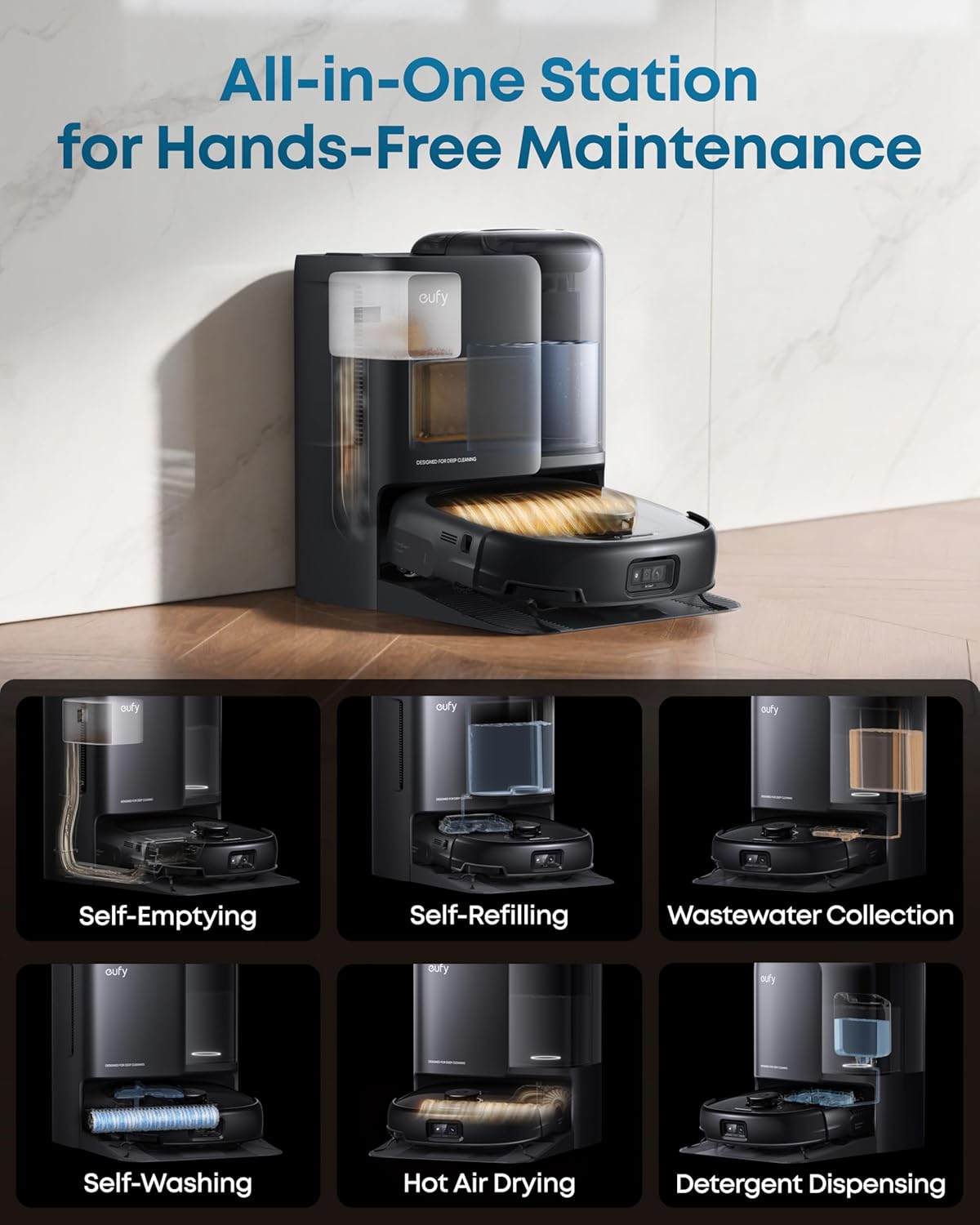 • All-in-One base station (self-emptying, self-washing, self-refilling, hot air drying & waste water management)
